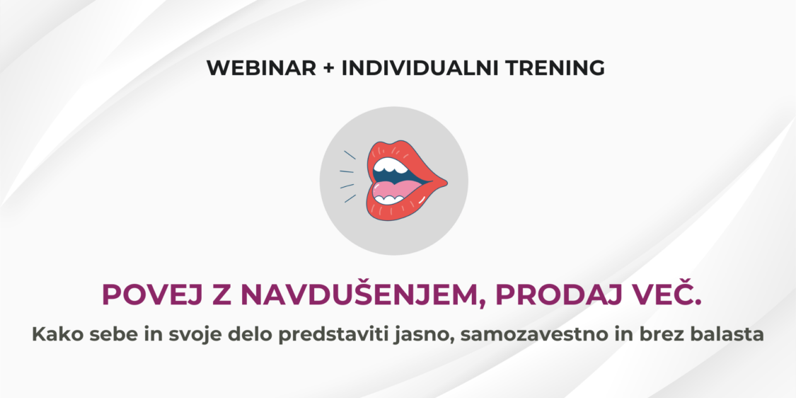 Na webinarju POVEJ Z NAVDUŠENJEM, PRODAJ VEČ bomo pogledali, zakaj se to dogaja in kaj je ključno, da o sebi in svojem delu govoriš jasno, zanimivo in samozavestno.